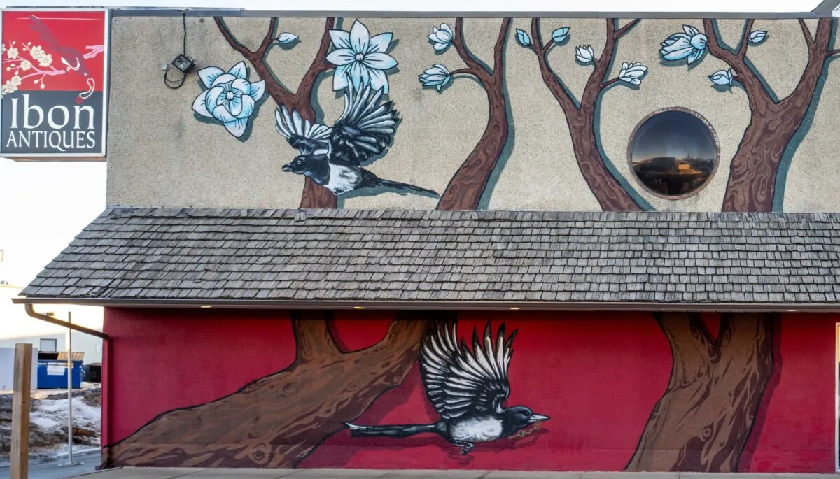The images were co-created by Josh Harnack (harnack.ca) and Robyn Schnierer (artbyrobynyeg.com/) in partnership with the Edmonton Mural Festival in 2022. The magpies live on the envelope of Edmonton business Ibon Antiques at 10423 79 Ave.